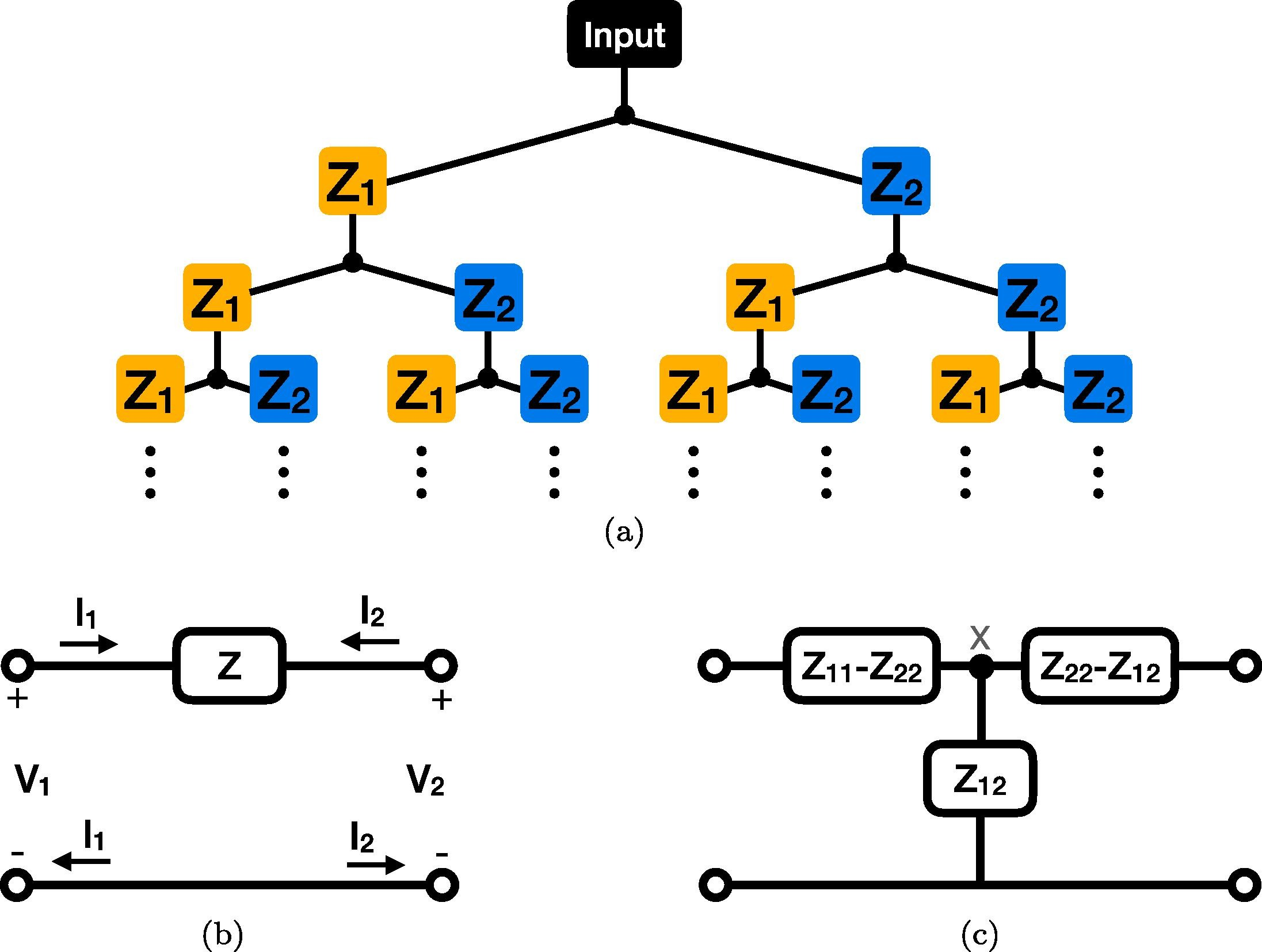 We seek to generalize and study the well-known Warburg impedance element, which has an impedance proportional to 1/s (s=jω is the complex frequency), to a two-port impedance network. For this purpose, we consider an infinite binary tree structure inside which each impedance is treated as a two-port network. We obtain a Warburg impedance matrix, which is both symmetrical and reciprocal, and study its equivalent circuit behavior. Interestingly, the equivalent circuit contains two resistors and a Cole–Davidson type impedance proportional to 1+2/(τs), where τ is a time constant. Simulation results