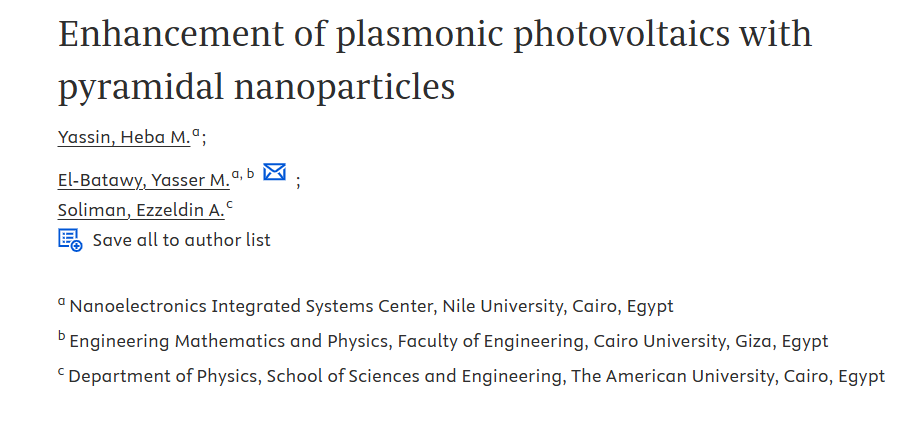 Light trapping as a result of embedding plasmonic nanoparticles (NPs) into photovoltaics (PVs) has been recently used to achieve better optical performance compared to conventional PVs. This light trapping technique enhances the efficiency of PVs by confining incident light into hot-spot field regions around NPs, which have higher absorption, and thus more enhancement of the photocurrent. This research aims to study the impact of embedding metallic pyramidal-shaped NPs inside the PV’s active region to enhance the efficiency of plasmonic silicon PVs. The optical properties of pyramidal-shaped
