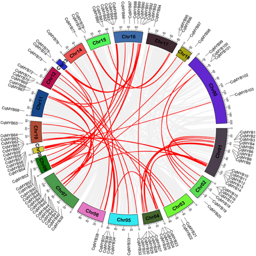 The MYB transcription factor (TF) are among the largest gene families of plants being responsible for several biological processes. The R2R3-MYB gene family are integral player regulating plant primary and secondary metabolism, growth and development, and responses to hormones and stresses. The phylogenetic analysis combined with gene structure analysis and motif determination resulted in division of R2R3-MYB gene family into 27 subgroups. Evidence generated from synteny analyses indicated that CqR2R3-MYBs gene family is featured by tandem and segmental duplication events. On the basis of RNA