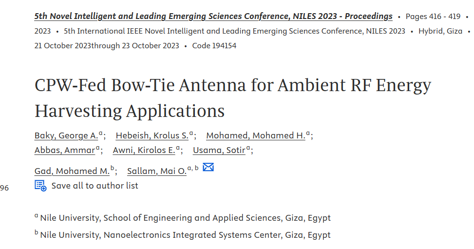 This paper presents a high-efficiency bow-tie antenna for ambient RF energy harvesting at the 2.4 GHz band. Moreover, a rectifier circuit that converts the AC into DC is proposed. The antenna is fed via a CPW transmission line where a quarter wavelength transformer is inserted to match the slot bow-tie with the 50-ohm transmission line. The structure is simulated using CST software, and results are validated using HFSS. The antenna's directivity, efficiency, and bandwidth are 6.63 dBi, 89.9 %, and 0.946 GHz respectively, as simulated using CST. The antenna is fabricated on a single-layer